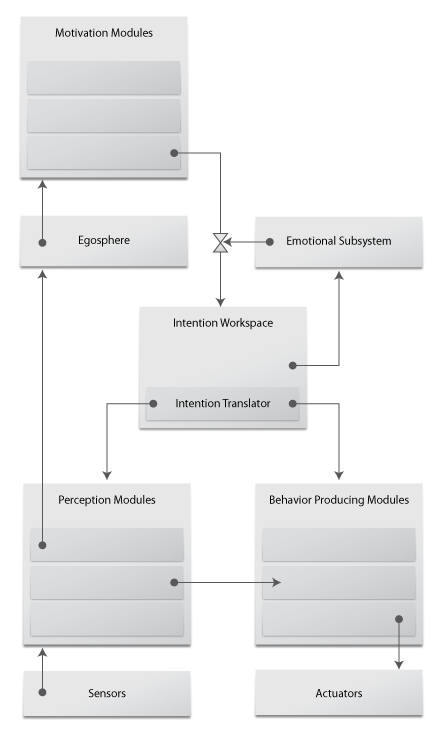 Our decisional structure remains heavily distributed. Motivation modules provides the system with high-level desires. The Intention Workspace acts as a blackboard - a sharing space for motivation modules to post their desires. The Intention Translator takes these desires and translate them into a tangible intention for the controlled robot. This means our motivation modules are loosely coupled with the actual robot, making them portable between different instances of our architecture. Selective attention mechanisms implemented within the translator try to make the most of our platforms' limited resources by selecting competing perceptual and behavioral strategies in line with the current situation. The Egosphere surveys perceptual events and builds a more manageable abstraction of every sensorial inputs provided by our hardware. The Emotional Subsystem regulates desires' intensities according to the simulated mood of the robot, which varies in relation to the current intention accomplishment.
